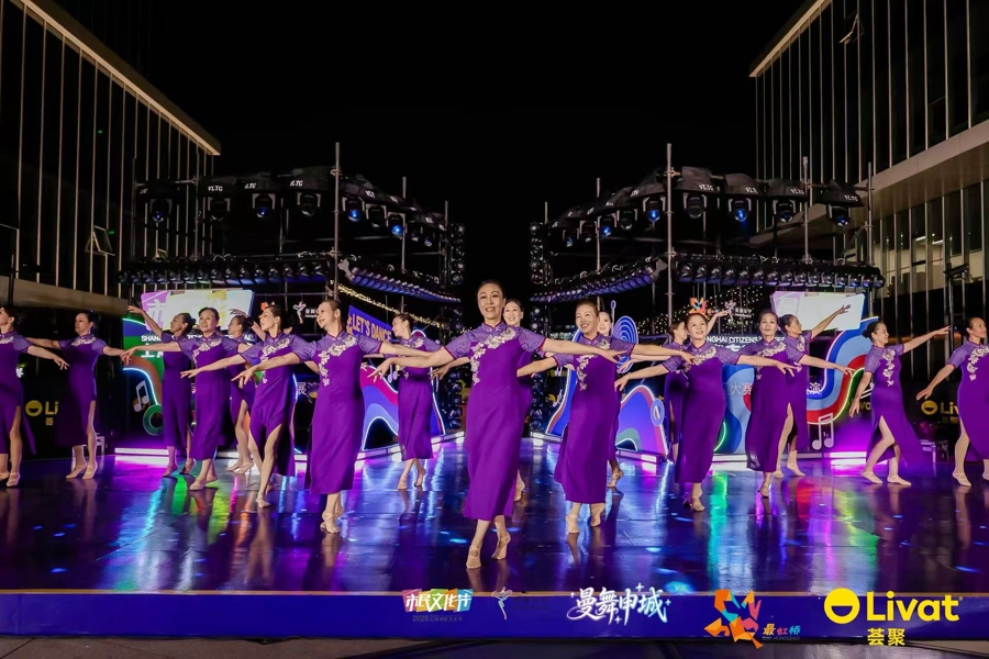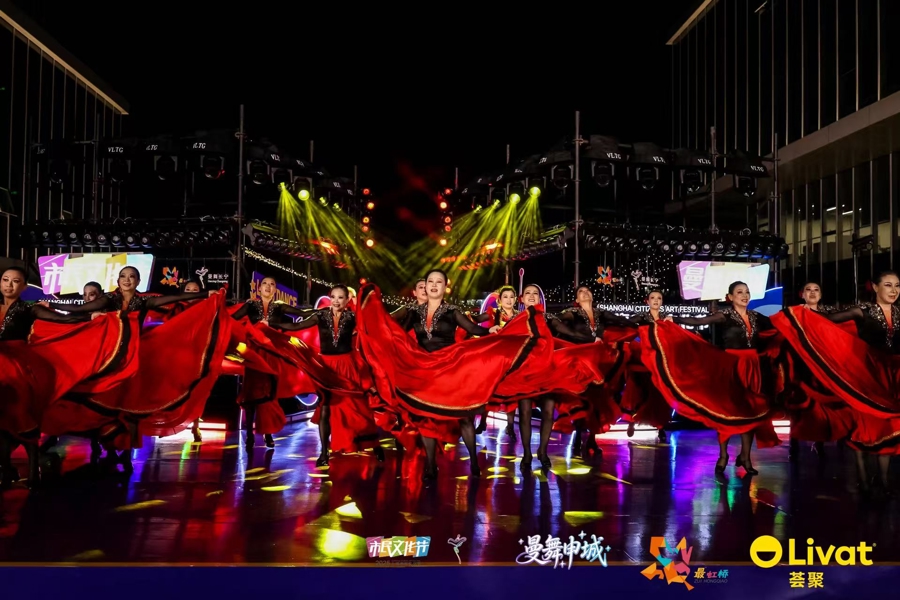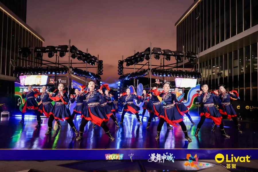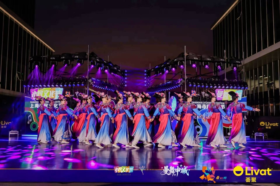 天色渐暗,伴随着热烈的节奏与炫丽的灯光,10月12日晚,“曼舞申城”——2025年上海市民文化节市民舞蹈大赛优秀节目展演活动在上海荟聚商场四楼室外北欧小镇上演。来自全市及长三角地区的优秀舞蹈团队欢聚一堂,以舞会友、以舞传情,为观众献上一场融合传统与现代、民族与时尚的舞蹈艺术盛宴。